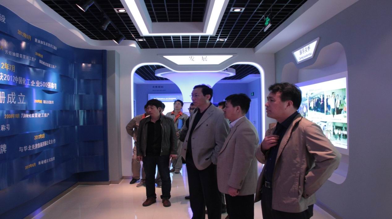 會議前,雙方一同來到新啟元展廳,就公司基本情況、現有裝置、人文等方面進行介紹,期間,雙方領導還就公司裝置工藝循環流程展開討論。