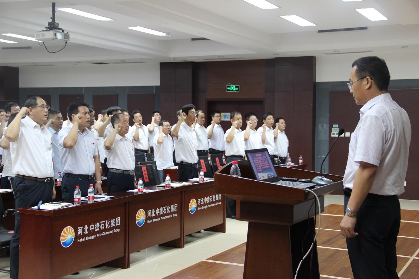 我宣誓:忠實于我的祖國,忠實于祖國的重要組成——中捷石化——蒼天之下一個不可分割的偉大團隊。在這里,人人享有真實和正義。從現在起,我決心每日做到:生產、創造、學習、成長,并且學會分擔,懂得分享,以熱情和愛抒寫激情燃燒的歲月篇章。伴隨著鏗鏘有力的宣誓聲,整個會議在集團公司于總的領誓下拉開序幕。