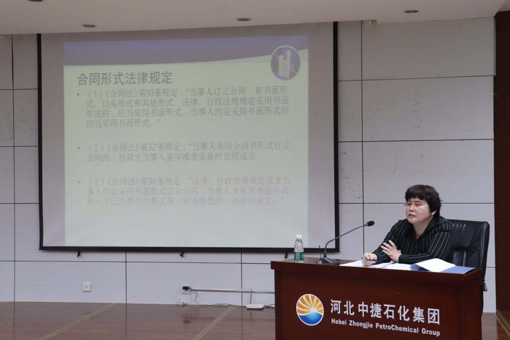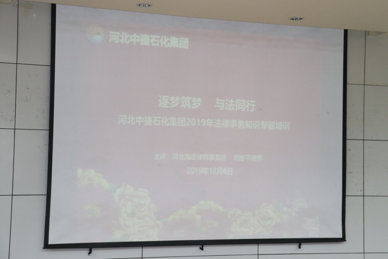 12月6日,集團公司在科研樓六樓會議室組織開展2019年“筑夢逐夢與法同行”法律事務知識專題培訓活動,旨在深入貫徹落實集團公司“學習是中捷石化園永不竣工的政治工程”的企業文化理念,提升集團公司整體綜合管理水平,促進公司依法經營、依法管理、依法參與市場競爭、依法維護自身合法權益,為公司“持續、穩定、創新、發展”營造良好的法治環境。活動特邀河北海岳律師事務所劉建平律師授課,集團黨委書記于國臣、總經理喬樹華、財務總監宋立峰、總工程師李金馬,各單位董事長、總經理、副總經理、總工、副總工、財務經理,相關采購、銷售、合同管理部門經理及主辦人員共計64人參加,集團審計部經理王力軍主持本次活動。