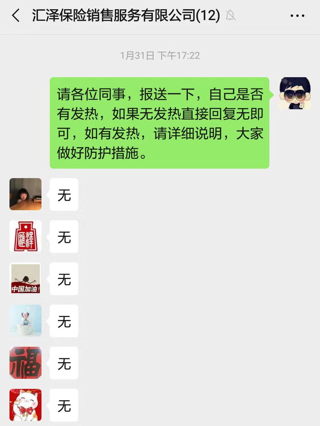 隨著防疫工作的深入,黨支部把收集單位員工信息、活動范圍、體溫檢測作為重要環節?,F在匯澤保險銷售服務有限公司全體員工自發加入到防控隊伍中,筑起了防控疫情的鐵壁銅墻。匯澤保險黨支部在落實防疫工作的同時,在公司群和支部群中時時發送疫情期間個人居家和復工防護要點,重點關注廣大員工身體健康和生命安全。