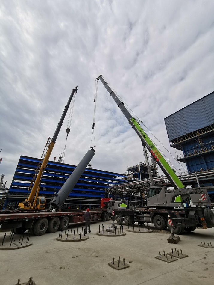 3月31日上午9時(shí),伴隨著指揮人員的一聲哨響,“吸附塔”在兩臺(tái)吊車(chē)的默契配合下平穩(wěn)起升,回轉(zhuǎn)、直立、就位一系列動(dòng)作嫻熟準(zhǔn)確,8臺(tái)“吸附塔”在2天內(nèi)相繼完成吊裝,順利完成了該項(xiàng)目建設(shè)的關(guān)鍵節(jié)點(diǎn)。此項(xiàng)目建成后可回收氫氣5500Nm3/h,為加氫裝置用氫提供保障。