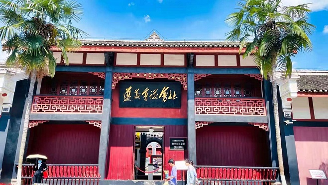 駐足遵義會議紀念館,首先映入大家眼簾的是紀念館門前大門正上方掛著的一塊黑漆金匾,上面有毛主席親自題寫的“遵義會議會址”6個金光閃閃的大字,字跡飄逸豪放。遵義會議紀念館的展廳內展示了大量文物、珍貴歷史圖片、文獻資料等,生動地再現了紅軍長征的歷程。“長征精神誨育千秋,遵義會議永放光芒。”遵義會議集中體現了堅定信念、實事求是、獨立自主、敢創新路、民主團結的精神。