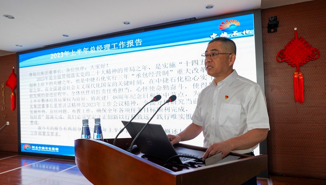 集團公司訊 7月16日上午,河北中捷石化集團2023年上半年工作會議在新啟元科研樓六樓會議室召開,集團公司董事長王振華,黨委書記于國臣,總經(jīng)理喬樹華,以及集團公司各主管領導,各所屬單位管理人員共計70余人參加了此次會議。會議由集團黨委書記于國臣主持。