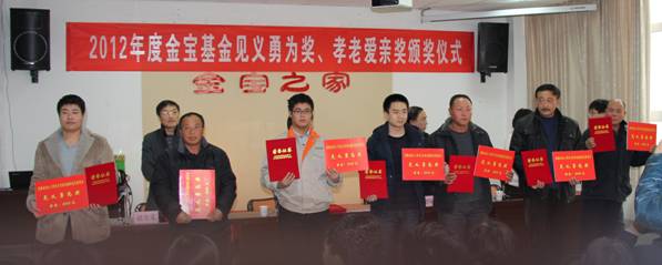 2012年12月12日下午,在金寶商城六樓培訓室內,舉行了2012年度金寶基金見義勇為獎、孝老愛親獎頒獎儀式,表彰了跳入臭水坑中勇救落水老人的新啟元員工杜國號等7名“見義勇為先進個人”。在大家熱烈的掌聲中,黃驊市委常委、宣傳部長程秀珍、副市長陳增強、金寶公司總經理趙金義、市文明辦主任等領導將榮譽證書和2000元的獎勵發到他們手中。