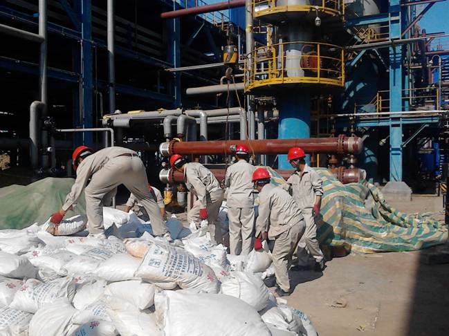 2013年8月20日上午, 新啟元PSA制氫裝置催化劑和填料充裝現場,參加施工的人員正有條不紊的開展工作。一組負責將庫存裝車;二組負責卸車;三組負責開啟密封;四組負責裝入吊籃;五組負責填充塔器;六組負責現場清理;七組負責食品和引用水保障。