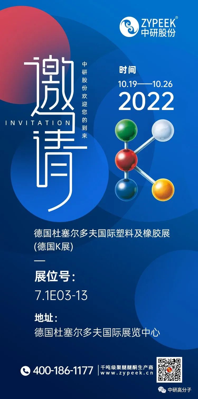 德國K展是國際塑料、橡膠工業界的盛會,于1952年創辦,三年舉辦一屆,2022年將迎來它的第二十二次盛會。該展會將匯聚世界各地的知名廠商,云集各國的專業買家,再現其獨特魅力及火熱場面,成為令人期待的特色盛會。本屆K展將于2022年10月19日至26日在德國杜塞爾多夫國際展覽中心舉行。 中研股份是集聚醚醚酮(PEEK)研發、生產、銷售為一體的現代化高新技術企業,也將借此機會,給大家帶來更多令人驚喜的材料創新和應用。此次中研股份派出了技術精英團隊和銷售精英團隊與您相約在德國展館7.1 E03-13。屆時,工作人員將根據產品特性及客戶的需求進行耐心細致的解答。